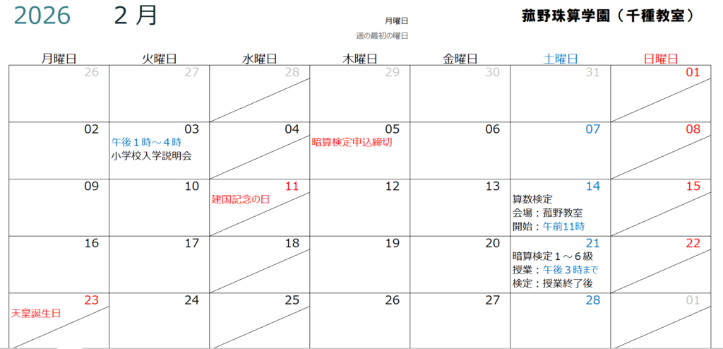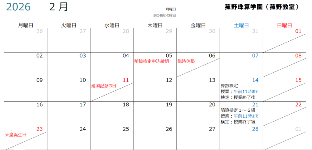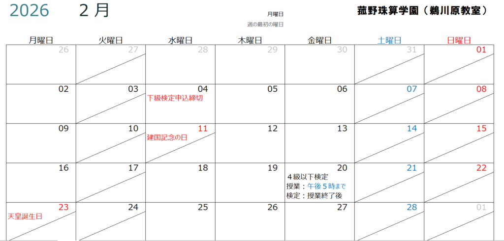 令和8年2月の授業日程